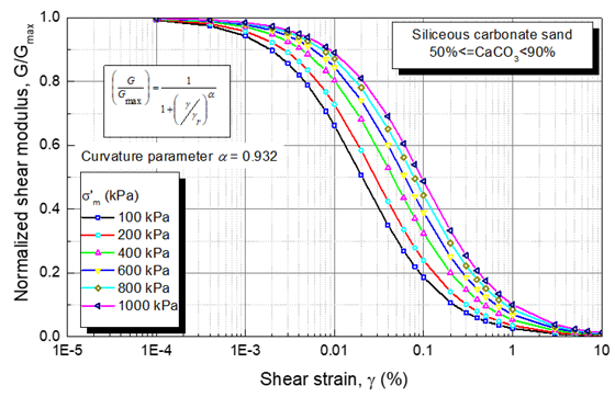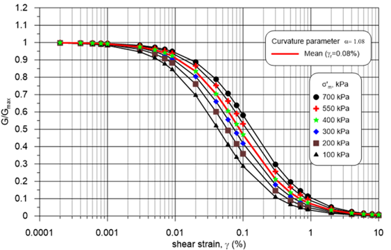 where α is called the curvature parameter and γr is the reference strain value at which G/Gmax = 0.5. This model uses only two parameters, and the reference strain provides an efficient normalization of shear strain. Equation (10) is adopted in this study to model the variation of G/Gmax with γ. For the sake of simplicity, the curvature parameter (α) is assumed independent of the effective confining pressure () and equal to α = 1.08.