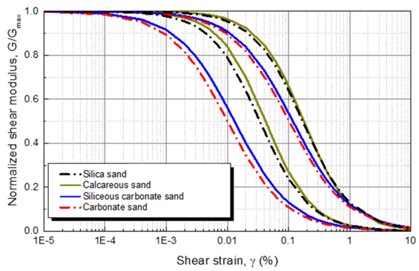 Figure 15 presents a comparison of the upper and lower bounds of G/Gmax versus shear strain for silica sand, calcareous sand, siliceous carbonate sand and carbonate sand. The upper and lower bounds of G/Gmax of silica sand are very similar to those of calcareous sands. This indicates that G/Gmax is not significantly affected when the carbonate content is less than 50%. The upper and lower bounds of G/Gmax of siliceous carbonate and carbonate sand are very similar, and very different than the calcareous and silica sand. This indicates that G/Gmax is affected when the carbonate content is higher than 50%.