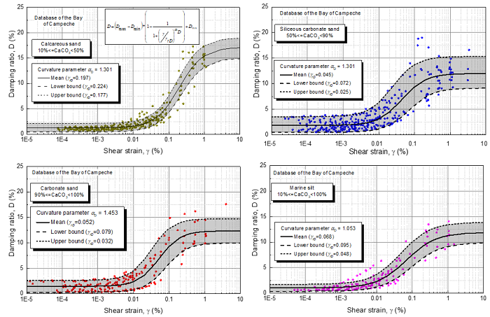 Figure 18 shows a comparison of the upper and lower bounds of damping ratio versus shear strain for silica sand, calcareous sand, siliceous carbonate sand, and carbonate sand of the Bay of Campeche and Tabasco Coastline. The damping curves of silica sand and carbonate sand are very similar, although the bandwidth is smaller in calcareous sand than in silica sand. The curves of siliceous carbonate sand and carbonate sand are very similar and show a different shape and width than the curves of silica sand and calcareous sand. This indicates there is a small effect on the curve of damping ratio when the carbonate content is smaller than 50 % and an important effect when the carbonate content is greater than 50 %. The damping ratio of siliceous carbonate and carbonate sands is higher than the calcareous and silica sands at shear strains smaller than about 0.1 % and shows an asymptotic value at shear strains larger than 0.4 %.