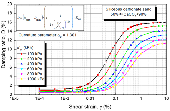 The database of calcareous sand, siliceous carbonate sand, carbonate sand, and silt with carbonate content between 10 % and 100 % is presented in Figure 16. Equation (12) was used to define the upper bound, mean, and lower bound of the curves of damping versus shear strain presented in this figure. The values of the curvature parameter (αD ) and reference strain γrD for these three curves as well as the values of Dmin and Dmax that define the mean curve of damping ratio versus shear strain obtained from regression analyses are presented in Table 2. For simplicity, αD was assumed constant and independent of effective confining pressure (σ´m), and its values are reported in Table 2.