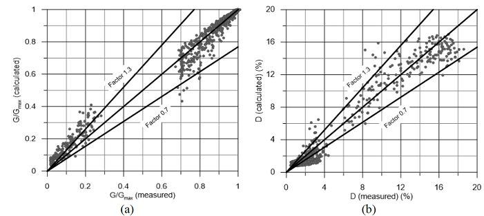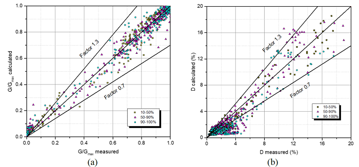 Comparison between measured and predicted values can be validated against the database. G/Gmax and D between predictions and measurements can best be assessed by plotting predicted against measured values for the 936 data points accumulated from all the tests. This is presented in Figure 9a for G/Gmax, where it can be seen that 85 % of the predictions lie within a factor of 1.3 and 0.7 from the measurements and values of G/Gmax less than 0.2 are being overpredicted. The same is presented for D in Figure 9b, where it can be seen that 80 % of predicted values lie within a factor of 1.3 and 0.7 from the measurements and values of D less than 4 % are being underpredicted.
