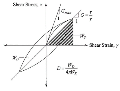 Two of the most important dynamic soil properties required to conduct an equivalent-linear seismic site response analysis to evaluate the soil amplification are: i) a curve of G/Gmax versus cyclic shear strain γ, also called modulus reduction curve, where G is the shear modulus and Gmax is the maximum shear modulus at very low shear strains of the order of 10−4% and ii) a curve of equivalent hysteretic or material damping ratio D versus γ, where D is defined from the measured area (WD) inside a complete hysteretic loop, which corresponds to the energy dissipated in one cycle, and the maximum strain energy stored during one cycle WS, through the basic expression (see Figure 3):