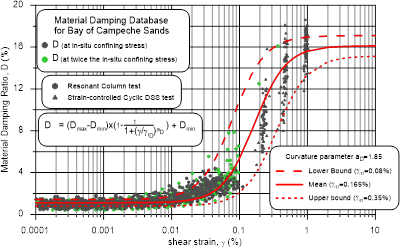 Therefore, it was necessary to develop a database of classification and index properties tests, in situ measurements of shear wave velocity using downhole P-S suspension seismic velocity logging, in situ piezocone penetration tests (PCPTs), resonant column tests to characterize the shear modulus and material damping ratio at small shear strains (10−5 % to about 0.1 %), and strain-controlled cyclic DSS tests to evaluate the decrease of shear modulus and the increase of material damping ratio at large shear strains (0.1 % to about 10 %) performed on sand from the Bay of Campeche, including sands with no carbonate content to 100 % of carbonate content retrieved from the seafloor to a penetration depth of 120 m below seafloor (BSF). The database was tailored specifically to develop empirical correlations for the Bay of Campeche sands to determine Vs when in situ measurements of Vs are not available and to develop numerical modeling to predict the variation of the normalized shear modulus (G/Gmax) and material damping ratio as a function of shear strains when no dynamic test results are available for all the sand layers.