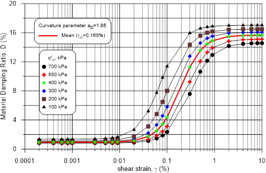 The resulting family of material damping curves using equation (12), varying from 100 kPa to 700 kPa in equations (13), (14), and (15) and considering the constant value of the curvature parameter aD= 1.85, is shown in Figure 8. It leads to the offsetting of the material damping ratio curves toward higher values of strain.