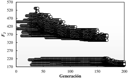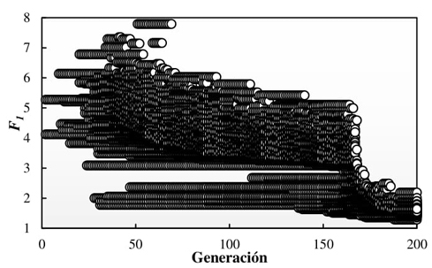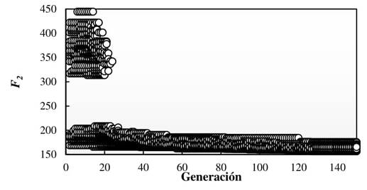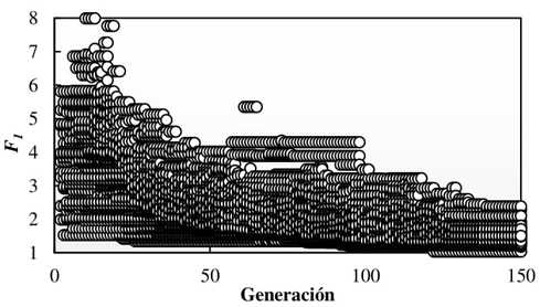 El comportamiento del algoritmo fue adecuado, al inicio todos los individuos corresponden a marcos penalizados por no ser constructivamente viables. A partir de la quinta generación comienzan a aparecer las primeras estructuras que cumplen con los criterios de conexiones y/o dimensiones de las secciones; sin embargo, no cumplen con el índice de daño. Desde la generación veinte surgen las primeras soluciones al problema, las cuales corresponden a estructuras con secciones robustas principalmente de CRP. Mediante la función objetivo de distorsión máxima de entrepiso (F1 ) y la penalización de periodo de vibración (PTN ) fue posible encontrar las soluciones más ligeras. El algoritmo inicialmente encuentra las columnas más económicas y ligeras, seguido por las trabes y por último los CRP.