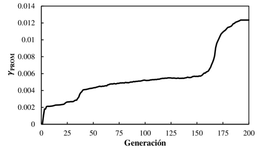 En este caso, el modelo posee una altura total de 42 metros y 3 variables más que el modelo anterior. Por tal motivo, se decidió utilizar un total de 300 individuos y 200 generaciones en el procedimiento de optimización. El comportamiento de las funciones objetivo fue similar al modelo anterior, lo cual se puede observar en las Figuras 9 y 10. En la Figura 11 se grafica la distorsión de entrepiso promedio de los individuos por cada generación de la primer corrida realizada para este modelo, donde se aprecia que a partir de la generación 155, el algoritmo comienza a encontrar soluciones más ligeras de forma abrupta, aumentando el promedio más del doble, además demostrando que el uso de 150 generaciones no es suficiente para este modelo.