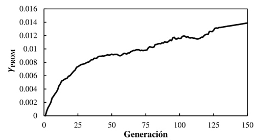 Este modelo corresponde a un edificio con 31.5 metros de altura, y cuenta con tres tipos de secciones para cada elemento estructural (trabes, columnas y CRP) como se muestra en la Tabla 4; es decir, está compuesta por 9 variables. Para llevar a cabo la metodología propuesta basada en la técnica de optimización NSGA-II, se estableció utilizar un total de 150 generaciones compuestas por 200 individuos. El comportamiento del algoritmo depende principalmente de F1 , debido a que su función es encontrar las estructuras más ligeras que cumplan con los criterios de diseño por desplazamiento y daño. Mediante el proceso de cruzamiento y mutación se espera que, con el paso de las generaciones, ambas funciones objetivo vayan disminuyendo hasta encontrar las soluciones óptimas. Las Figuras 5 y 6 muestran la evolución de F1 y F2 se observa que al inicio existen valores muy elevados, ya que la mayoría de los individuos se encuentran penalizados. De igual manera, con el paso de las generaciones se espera que el promedio de las distorsiones máximas de entrepiso (γPROM ) vaya aumentando, aproximándose al límite permisible (0.02). La Figura 7 grafica el comportamiento de una corrida del algoritmo para el modelo CR-CRP9, donde se aprecia que se cumple lo mencionado anteriormente. Al inicio del algoritmo γPROM obtiene un valor de 0 ya que todos los individuos creados están penalizados mediante la función Pcon , y siendo individuos no viables constructivamente, se omite el análisis estructural. En las primeras 50 generaciones el algoritmo encuentra la combinación de secciones transversales con mayor probabilidad de cumplir con los criterios de resistencia, las cuales corresponden a secciones robustas y con grandes cantidades de acero, conformando estructuras sobradas en términos de costo, resistencia y desplazamientos. Con el paso de las generaciones, el algoritmo va descubriendo secciones cada vez más ligeras y con menor cantidad de acero de refuerzo, lo que resulta en estructuras más livianas y con desplazamientos mayores. Sin embargo, dichas estructuras mantienen su seguridad y economía.