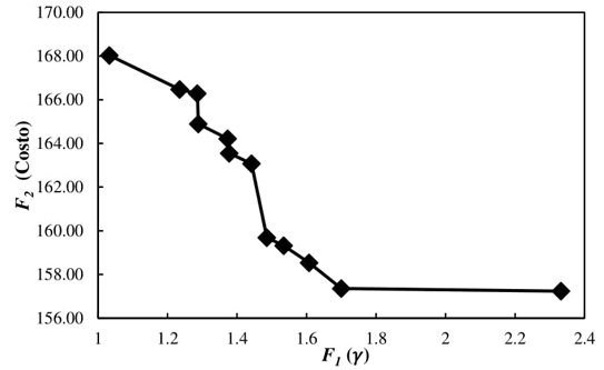 Al ser una estructura con mayor tamaño y combinación posible de variables, se esperaba un mayor número de ejecuciones del algoritmo y una Frontera de Pareto con mayor número de soluciones. El algoritmo fue necesario ejecutarse un total de 7 veces, pero la Frontera de Pareto resultó de 7 individuos como se observa en la Figura 12. Al realizar nuevas ejecuciones del programa, algunas soluciones eran dominadas por nuevos individuos, reduciendo su tamaño.
