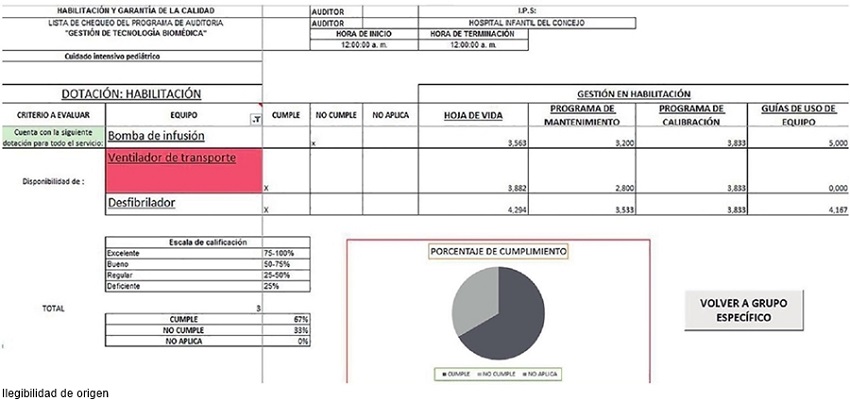La evaluación de equipos médicos tiene en cuenta cuatro variables: hoja de vida, programa de mantenimiento, programa de calibración y guías de uso de los equipos. Cada una de estas variables, se califica en una escala de uno a cinco de acuerdo a diferentes criterios que la HA despliega durante la actividad de evaluación. Cuando se ha terminado de evaluar un servicio con la HA, una tabla dinámica de la herramienta despliega los resultados cuantitativos y además una normativa utilizada en la HA. Cuando un equipo médico no cumple algún parámetro, la HA lo resalta en el listado, indicando una alarma visual para el auditor (color rojo). La Figura 2 ilustra un ejemplo de auditoria del servicio de cuidado intensivo pediátrico, allí se observan los valores para cada ítem y se resalta el ventilador mecánico como equipo que incumple la norma.