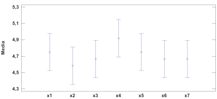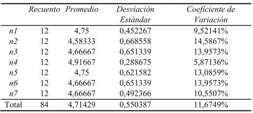 Se realizó un análisis estadístico de los datos obtenidos utilizando la herramienta estadística Stagraphics. Se calcularon los promedios, desviaciones estándar y coeficientes de variación para cada ítem, encontrando valores altos para los criterios n2, n5 y n6. En la Tabla 9 se observa que el criterio n2 genera una desviación estándar de 0,66 y por lo tanto un coeficiente de variación de 14.58%, lo que indica que este criterio posee un grado de dispersión mayor comparado con los demás. Por su parte n5 y n6 presentan valores de 13.085 y 13.95 % en su coeficiente de variación, en consecuencia, los criterios n2, n5 y n6 por tener coeficientes de variación altos requieren de mejoras y ajustes significativos en su planteamiento para que sean más aceptados por los futuros usuarios de la herramienta. Se evaluó también la hipótesis nula de las desviaciones estándar dentro de cada una de las siete columnas y se concluye que estas son iguales. Hallando el valor-P se encuentra que este es mayor o igual que 0,05, por lo tanto, no existe una diferencia estadísticamente significativa entre las desviaciones estándar al ser calculadas con un nivel del 95.0% de confianza. Por último, se analizaron las medias con un nivel de confianza de 95%, en la Figura 5 se observa que el criterio n4 presenta un valor más alto, lo que indica que este tuvo mayor aceptación por parte de los jueces, convirtiéndose así en un criterio referente para los demás. Entre tanto se observa que los criterios n2 y n6 poseen valores más bajos lo que permite interpretar que son los que requieren un mayor ajuste.