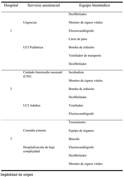 La auditoría se realizó de acuerdo a la distribución de los servicios asistenciales y de los equipos biomédicos seleccionados como se muestra en la Tabla 1.