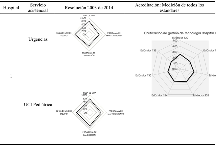 Para el hospital 1, los resultados muestran que la brecha más significativa es de un 37% para el ítem del programa de mantenimiento y de un 30% para el programa de calibración de equipos médicos. Por su parte, los resultados frente al grupo de estándares de acreditación no fueron tan positivos, debido a que el promedio se ubicó en dos en la escala de uno a cinco.