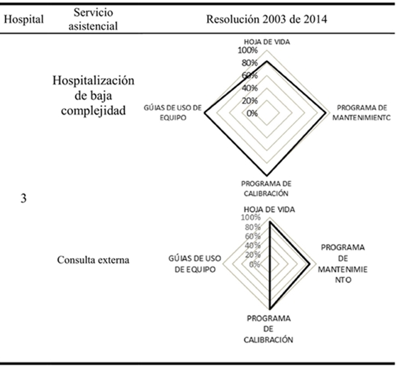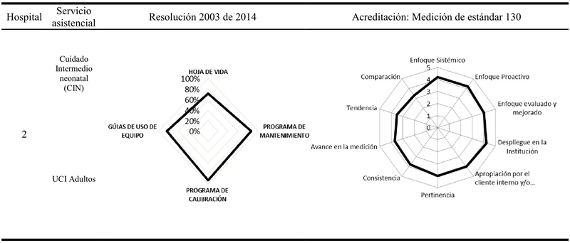 El hospital 2 tuvo la brecha más significativa en el ítem de hoja de vida y registro de actividades de mantenimiento, por lo tanto, requiere mejorar un 42% este proceso para alcanzar niveles óptimos de cumplimiento de la normatividad. En cuanto a la evaluación de la calidad, se realizó una medición puntual en el cumplimiento del estándar 130 [6]. Este entregó un resultado de cuatro, lo que contrasta con la amplia experiencia de esta institución en actividades de acreditación en salud. Por último, en el hospital 3 se identificó la brecha más importante en el ítem de hoja de vida y registro de actividades de mantenimiento preventivo, siendo esta del 18%.