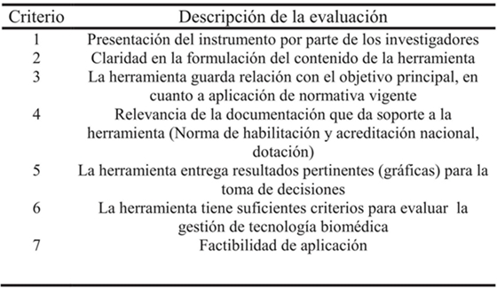 Para la evaluación de la HA se utilizó un formato con siete criterios los cuales se muestran en la Tabla 5. La selección de los jueces expertos se realizó con base en los criterios planteados en la metodología de este estudio, finalmente se escogieron 12 jueces distribuidos así: siete ingenieros clínicos y cinco auditores con experiencia. La HA se sometió a juicio por parte de los jueces, quienes la valoraron de acuerdo a los siete criterios definidos.