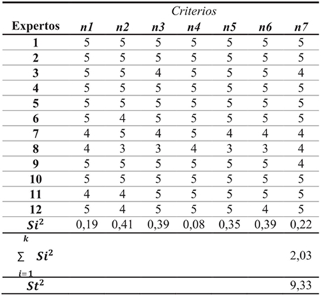 La confiabilidad de la HA se midió a través del cálculo del coeficiente alfa de Cronbach α, por lo tanto, se organizaron los valores como se muestran en la Tabla 6 y se reemplazaron en la Ecuación 1. Se obtuvo un α=0.90, lo cual indica que el instrumento tiene una consistencia interna adecuada y por lo tanto una buena correlación en las respuestas entregadas por los jueces. El grado de asociación del juicio de expertos se midió a través del CCS, para lo cual se aplicó la Ecuación 2 con base en las Tablas 7 y 8. Reemplazando los valores se obtiene un CCS de 0,88; para este caso se interpreta que un alto valor del coeficiente calculado indica un alto grado de consenso entre los jueces consultados y por lo tanto un acuerdo en sus respuestas.