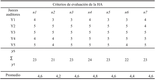 Doce expertos sometieron la HA a juicio con base en siete criterios, allí se evaluó la confiabilidad y el grado de consenso de los jueces. El coeficiente alfa de Cronbach α fue de 0.90 demostrando que la consistencia interna del instrumento es apropiada, entre tanto que el CCS fue de 0.88 indicando un alto grado de consenso entre los jueces consultados.