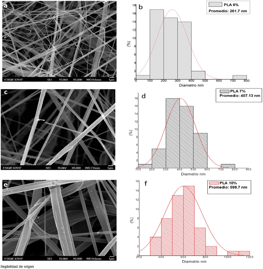 En la Figura 1; se puede observar la morfología de los andamios hilados de las diferentes concentraciones poliméricas de PLA por medio de SEM. Las micrografías indican que la técnica de AJS logra producir fibras con morfología homogénea en las diferentes concentraciones de PLA (6, 7, y 10 %) con una organización aleatoria y con un notable diferencia en el diámetro de las fibras cuando la concentración de PLA se incrementa. El andamio hilado de PLA con 6 % presenta un diámetro promedio de 261 nm, seguido del andamio con 7 % con un diámetro promedio de 407 nm y finalmente el andamio de PLA al 10 % con un diámetro promedio de 599 nm (Figura 1). Esto significa que la técnica depende de la viscosidad de la solución y que puede determinar un diámetro específico con una morfología superficial por la técnica de AJS.