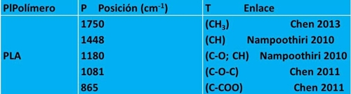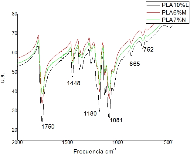 En la Figura 2 se puede apreciar los espectros de infrarrojo que nos indica las bandas características del espectro PLA (Tabla 1), donde se puede apreciar que hay mínimas diferencias entre los espectros de los andamios hilados la cual se debe a las diferentes concentraciones de PLA utilizadas.