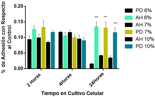 Para establecer el efecto de los andamios hilados de PLA sobre la adhesión celular, las células BM-MSC fueron cultivadas en contacto directo sobre los andamios hilados y películas delgadas de PLA (6, 7, y 10 %) a una densidad celular de 5x103 células/ml y se cultivaron durante 2, 4 y 24 h. Después del tiempo de incubación, los cultivos fueron lavados cuidadosamente con una solución de fosfatos (PBS) para retirar las células no adheridas e incubados con una solución al 4 % de paraformaldehído (PFA) durante 30 min. Pasado el tiempo, se lavaron con PBS y se incubaron con una solución de cristal violeta al 0.1 % por 15 min. Posteriormente, la solución de cristal violeta fue retirado y se realizaron lavados con agua bidestilada por 15 min y el colorante fue extraído con 400 μl de una solución de dodecilsulfato de sodio (SDS) al 1 %. De la solución obtenida se tomaron 200 μl que se colocaron en un pozo de una placa de 96 pozos para ensayos de ELISA y fue sometido a lectura en un espectrofotómetro (ChroMate, AWARNESS) a 545 nm. Los cultivos controles fueron las células sembradas sobre los platos de cultivo considerándose como 100 % de adhesión celular en los tiempos de incubación para obtener el porcentaje de adhesión a los andamios hilados o películas delgadas de PLA.