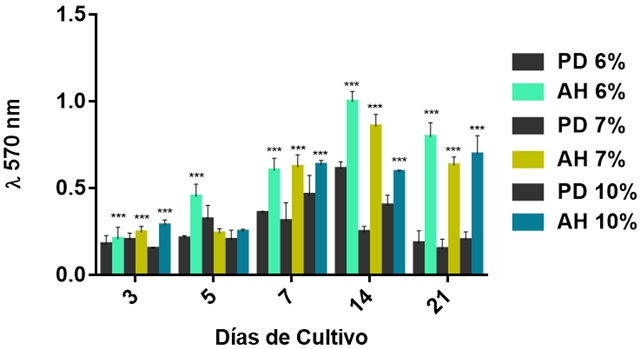 Para corroborar lo anterior, nosotros llevamos a cabo un ensayo de viabilidad celular para confirmarlo. Los resultados son presentados como absorbancia a 570 nm (Figura 4). Como se puede observar los resultados del ensayo de viabilidad por la conversión de la sal de MTT por parte de las células mesenquimales se ve favorecida en los andamios hilados de PLA en las diferentes concentraciones (6, 7, y 10 %) cuando se comparan con las películas delgadas de PLA (6, 7, y 10 %) a los diferentes tiempos de cultivo celular encontrándose diferencias estadísticamente significativas a p < 0.05. Sin embargo los andamios hilados de PLA al 6 % muestran un incremento en dicha reacción en comparación con las películas delgadas de PLA al 6 % desde el tiempo 3 hasta el día 21 de cultivo. Asimismo; en los andamios hilados de PLA al 7 y 10 % se observa mayor proliferación a partir del día 7 al 21 en comparación con las películas delgadas a las mismas concentraciones de PLA (7 y 10 %). Este incremento que se observa en los andamios hilados de PLA (6, 7 y 10 %) es directamente proporcional al incremento de las células metabólicamente activas sobre las superficies; lo cual nos indica que las células están proliferando, creciendo y no existe ningún efecto citotóxico del material a las células BM-MSC.