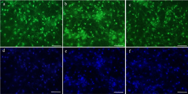 Las células BM-MSC se sembraron a una concentración de 5x103 células/ml durante 24 h sobre los andamios hilados de PLA. Posteriormente, para visualizar la interacción de las células con el material; las células se tiñeron con una solución stock de calceína-AM con una concentración final de 5 µM (CellTracker) y DAPI a una concentración de 0.5 µg/ml en medio libre de suero por 30 min. Pasado el tiempo se lavaron con PBS y la morfología que adquieren las células al interactuar con las membranas fibrilares de PLA se observó por medio de microscopía de fluorescencia.