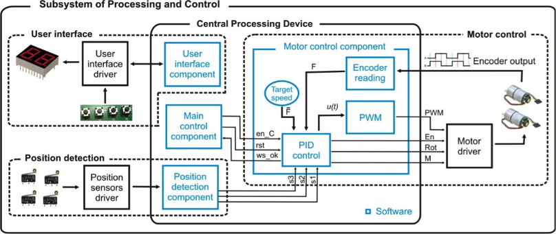 The features offered by microcontrollers meet the needs of the proposed system in this project. Therefore, SYRR-NERI is a microcontroller-based embedded system. Due to the close relationship between hardware and software subsystems of this type of system, this section describes both subsystems together. In this paper, this union is referred to as Subsystem of Processing and Control. Figure 10 shows the main components that make up the Subsystem of Processing and Control, and the relationship between them. These components are grouped to form modules that perform a specific function. Therefore, this subsystem is comprised of four modules: Central processing device, User interface, Motor control and Position detection. Each of these modules includes a hardware section and a software section. Determining the current position of the mechanical subsystem of SYRR-NERI is carried out by the Position detection module. To this end, this module has two snap action switches per motor, SAS={SAS4,SAS3,SAS2,SAS1}, see Figure 10.