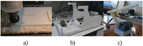 In this section, the manufacturing and assembly process for the SYRR-NERI is described. The machining of the parts was made on CNC machines using different materials such as nylamid, acrylic, polyvinyl chloride and palight. It is important to mention that the machining and assembly processes were carried out in their entirety within the facilities of the Universidad Tecnológica de la Mixteca. In Figure 11 some stages of the manufacturing and assembly process are shown. For more details about the construction of the prototype, see [23].