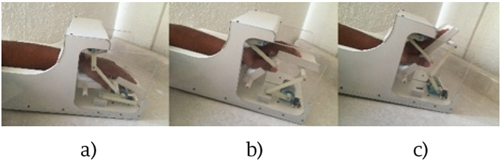 Due to the desired movement, a plane mechanism is considered because of its simplicity over a spatial mechanism. The four bar mechanism was chosen because it is one of the simplest solutions for movement in a plane [21]. Two coupled four bar mechanisms were proposed (Figure 4a). The extension/flexion movement of the hand is carried out by the link 4 of the mechanism 1, see Figure 4b, while the movement of the fingers is developed by the link 4 in mechanism 2, Figure 4c.