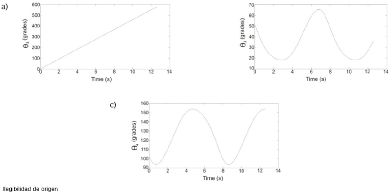 In Figure 6, the angular positions as a time function for mechanism 1 are shown. As can be observed in Figure 6a, a constant angular velocity is considered as the mechanism input. Velocity equations for a closed four bar mechanism are given by Equations (6) and (7) [21].