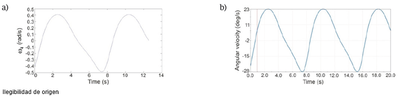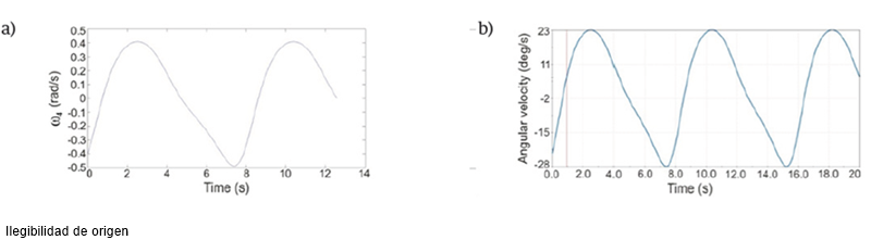In Figure 7a the angular velocity of the output link of mechanism 1 is presented. To verify these results, the mechanism movement was simulated in Solid Works. The results for angular velocity of the output link of mechanism 1 is shown in Figure 7b. As can be observed, the results obtained from Solid Works are consistent with those found with Matlab. The acceleration analysis was carried out using Equations (8) and (9) [21]. Results for links 3 and 4 are presented in Figure (8).