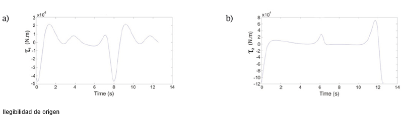 The interconnection forces Fik are used to design the connector between the mechanisms links. The obtained torques Ts are taken into account when selecting the driver motors for each mechanism. In Figure 9 the calculated torques for both mechanisms are shown.