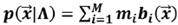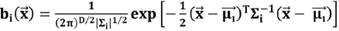 (17)En la ecuación 17, es un vector aleatorio D- dimensional (vectores acústicos MFCC, o Cuartiles). Bi, ∀i= 1, … , M son las densidades de probabilidad de la mezcla y mi, ∀i= 1, … , M son las ponderaciones de cada densidad en el modelo. Cada densidad componente es una función Gaussiana D-dimensional18, 19. Además, las ponderaciones de las mezclas deben satisfacer la restricción ∑Mi mi = 1. Cada densidad Gaussiana contiene los parámetros representados en la Ecuación 18.