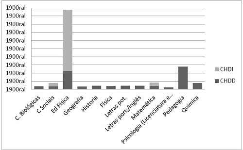Para ilustrarmos graficamente o percentual de carga horária que aborda a temática em relação à carga horária total do curso apresentamos a Figura 1. Ao observarmos, é possível perceber que 48,8% da carga horária do curso de Educação Física se destina, em algum momento, a discutir a educação especial, a inclusão escolar e/ou seu público-alvo. Já o curso de Pedagogia destina aproximadamente 14% da sua carga horária especificamente à formação de seus alunos na área de educação especial. Os cursos de Ciências Sociais, Matemática e Química reservam, respectivamente, 3,9%, 4,2% e 3,8% à preparação dos egressos para atuarem com o público-alvo da educação especial, enquanto os demais cursos reservam em média 1,9% para oferecer formação em Libras aos seus alunos.