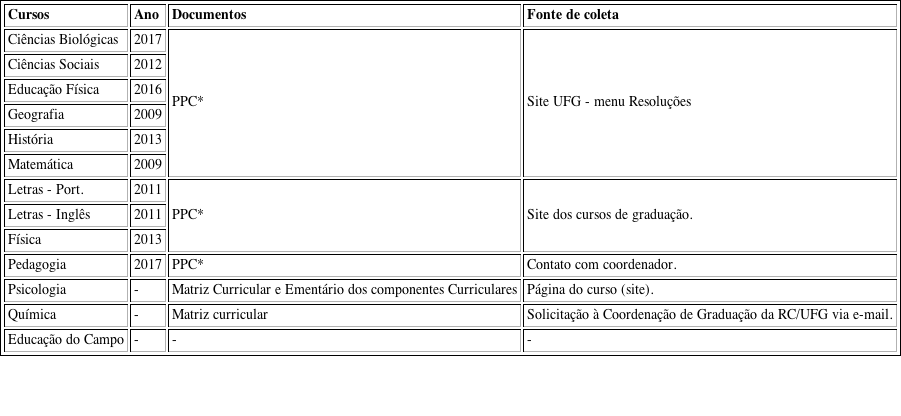 A coleta de dados se deu inicialmente no ‘site’ da instituição (menu ‘Resoluções’), em que usamos o nome dos cursos como descritores para busca do PPC com resoluções aprovadas pelo Conselho de Ensino, Extensão e Cultura da UFG, e com este procedimento de coleta encontramos 7 PPC. Em seguida, pesquisamos os ‘sites’ dos cursos de graduação (apenas para os cursos de graduação que não encontramos o PPC no ‘site’ da UFG) e encontramos 3 (três) PPC, 2 (duas) Matrizes Curriculares e 1 (um) Ementário dos Componentes Curriculares. Mas, visando padronizar a análise de dados e obter todos os documentos de todos os cursos, entramos em contato com a Coordenação de Graduação da Regional Catalão e com os coordenadores dos cursos de Pedagogia, Educação do Campo, Psicologia (tínhamos apenas a matriz e ementário dos Componentes Curriculares) e Química. Obtivemos retorno do curso de Pedagogia, que nos enviou por e-mail o PPC, e da Coordenação de Graduação, que nos enviou a matriz curricular dos cursos de Psicologia (já tínhamos), Química e Pedagogia (a Coordenação enviou o PPC). O quadro 1 ilustra os documentos e as fontes de coleta de dados.