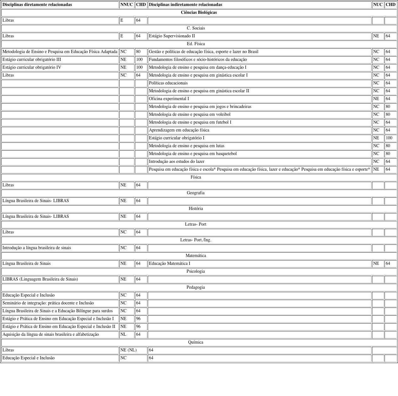 Já os cursos de Educação Física (3), Pedagogia (5) e Química (1) dispõem de disciplinas específicas que irão subsidiar a capacitação do professor de classe comum no atendimento ao aluno público-alvo da educação especial. Entre as disciplinas específicas, o curso de Educação Física e Pedagogia oportunizam aos discentes a formação prática para o atendimento a estas demandas por meio de estágios em educação especial.