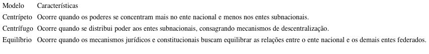 Considerando a variedade de países que adotam o modelo federativo de organização do Estado, alguns autores, como Ventura (2002), Martins (2011), Abruccio (2010), Oliveira (2007) e Bobbio (2010) mencionam diferentes tipos de federalismo encontrados pelo mundo, muito relacionados às questões históricas, culturais, políticas e geopolíticas de cada país. Há certo consenso em categorizar os tipos de federalismo, conforme apresentado no Quadro 1.