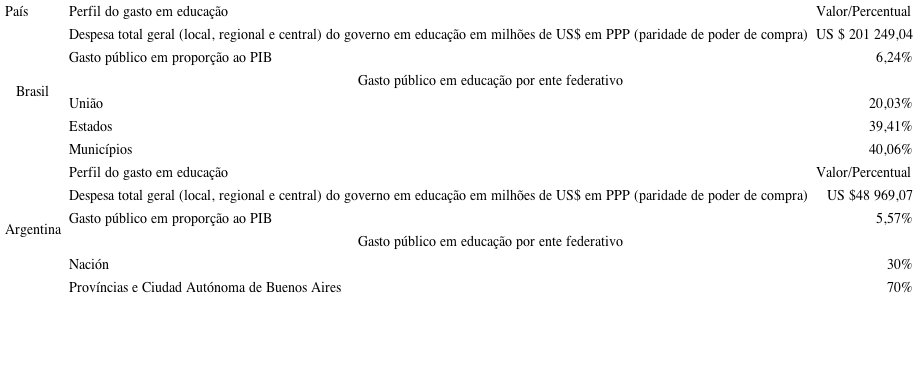 Sobre esse Quadro, cabe explicar que os percentuais de despesa total geral do governo em educação em milhões de dólares foram retirados do banco de dados do Unesco Institute for Statistics (UIS), no qual a moeda nacional (Peso na Argentina e Real no Brasil) é convertida em dólares com paridade do poder de compra com o ano base de preços constantes 2014. Os dados do gasto público em proporção ao PIB também foram retirados do UIS e contabilizam o gasto total, incluindo todas as esferas de governo e todos os níveis ensino, inclusive educação superior. Em linhas gerais, o que o Quadro mostra, em valores monetários e percentuais, é o que já foi anteriormente pontuado: a maior participação dos entes subnacionais nas responsabilidades de financiamento da educação básica nos dois países.