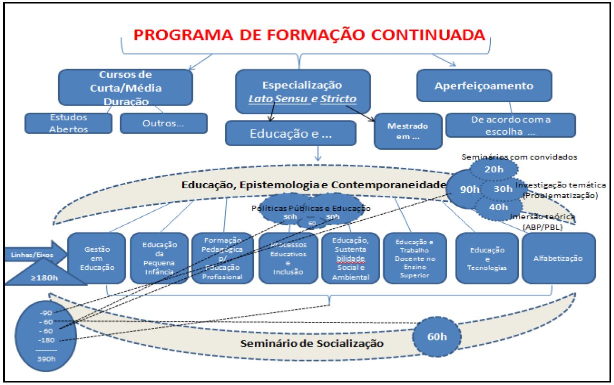 Foi assim que percebemos, inicialmente, a proposição do desenho curricular que sistematiza a proposta do Programa Institucional de Formação Continuada para Professores e Trabalhadores da Educação desenvolvido pelo IFC, particularmente a concepção de formação existente na proposta construída por um coletivo de professores. Conforme podemos observar na Figura1, o Programa mencionado possibilita a oferta de cursos de curta e média duração, cursos de Pós-Graduação lato sensu em Educação com oito ênfases, um curso de Mestrado em Educação e cursos de aperfeiçoamento.