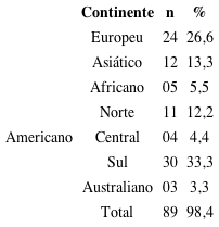 Partindo do número de 90 artigos, analisou-se o contexto em que as pesquisas foram realizadas, levando-se em conta o idioma e a localização das publicações. Verificou-se que a maioria (56%) dos artigos está publicada em inglês, 23% em português e 19% em espanhol. As pesquisas foram desenvolvidas em 33 países abrangendo amostras variadas de estudantes, incluindo uma constituída por estudantes brasileiros e portugueses, não tendo sido, por isso, computada. Na Tabela 1, apresenta-se a quantidade dos artigos por continente, estando o americano dividido em Norte, Centro e Sul.