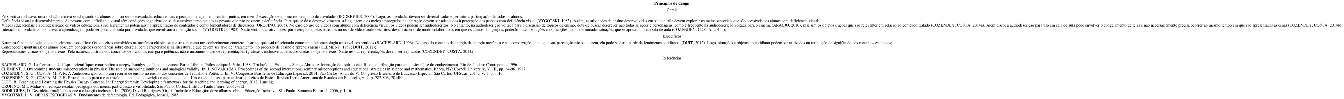 ABSTRACT: This paper presents a discussion about the use of audio description as a teaching resource in physics classes. The study aims to describe, propose and analyze a proposed audio description of an educational video. The research seeks to analyze the use of audio description with blind and low vision students, and students who are not visually impaired. Based on the data collected, a didactic sequence for the teaching of energy conservation was developed. The results show that audiodescription, besides being an important teaching resource for blind and low vision individuals, can facilitate the understanding or explanation of a concept to students who do not present visual limitations.