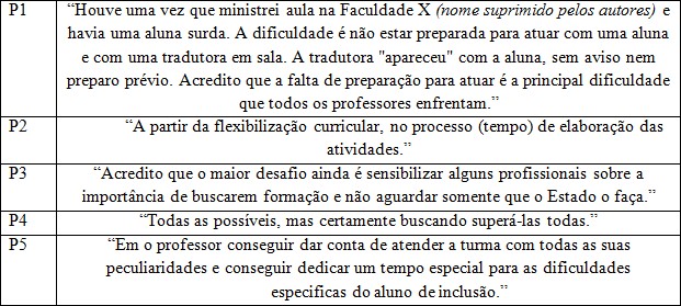 A dificuldade na promoção da inclusão do estudante com deficiência no ensino regular, embora seja uma problemática largamente pesquisada teórica e empiricamente, Carvalho (2005, p. 15) lembra que “embora as escolas possam desenvolver inúmeras ações em prol da inclusão, também é verdade que elas enfrentam inúmeros limites que só poderão ser superados com mudanças sistemáticas nas políticas nacionais, com ênfase para as que dizem respeito diretamente à educação”. Corroborando isto cabe destacar o discurso de P3, conforme o Quadro 4, quando afirma que não basta aguardar a benevolência do Estado, ao invés, é preciso buscar formação e motivar os demais pares a fazerem o mesmo.