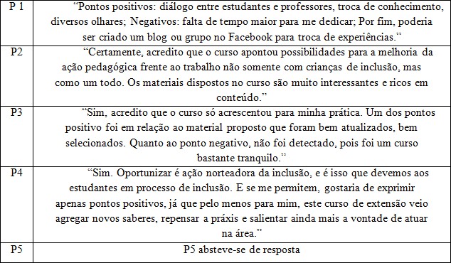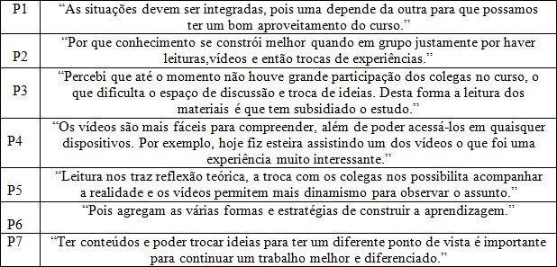 Sobre a vivência do curso online em detrimento das pretensões de mudança das práticas pedagógicas pelos próprios participantes que responderam a “Avaliação Formativa”, houve unanimidade nas respostas no sentido de agregação de novos saberes, oportunidade de atualização profissional, de compartilhamento de ideias entre professor tutor – cursistas e até de encorajamento, conforme observado no discurso de P4 disposto no Quadro 5.