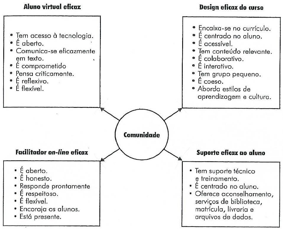 Sobre os elementos de um curso online com qualidade, Palloff e Pratt (2004, p. 142) elencam suas características e performance satisfatória de aprendizagem conforme a Figura 1. Sobre um desenho didático eficaz do curso, os autores ressaltam a questão da conexão com o currículo, o enfoque no aluno, a acessibilidade do curso, relevância de conteúdos, a aprendizagem colaborativa, interatividade, o tamanho do grupo, coesão e abordagem.