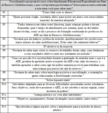 Conforme observado nas respostas anteriores, dispostas nas afirmações de P1, P3, P6, P10 e P12, as expectativas acerca de um curso de AEE focado em Salas de Recursos Multifuncionais permeiam o plano da promoção da inclusão, a saber, as metodologias adequadas para cada tipo de necessidade especial, os materiais pedagógicos e atividades adaptadas.