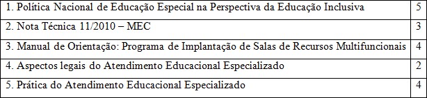 Como descrição discursiva conceitual/procedimental (ementa) o curso teve: “O Atendimento Educacional Especializado nas Salas de Recursos Multifuncionais como complemento e suplemento à escolarização do estudante em processo de inclusão no ensino comum”.