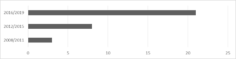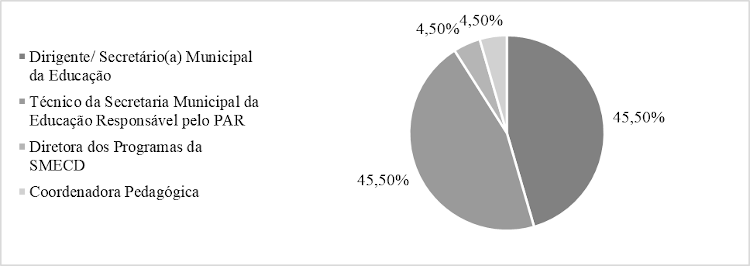 Assim, para a efetivação da pesquisa, o link da página do questionário foi enviado a todas as 43 (quarenta e três) Secretarias de Educação dos municípios da AMZOP, obtendo resposta de 22 (vinte e dois) questionários, o que equivale a 51% (cinquenta e um por cento) do total. O preenchimento dos questionários foi realizado pelos Dirigentes/Secretários Municipais de Educação (45,5%), pelos Técnicos da Secretaria Municipal da Educação Responsável pelo PAR (45,5%), pela Diretora dos Programas da Secretaria Municipal de Educação (4,5%) e pela Coordenadora Pedagógica da SME (4,5%). Destes, 21 (vinte e um) participaram da elaboração do PAR 2016/2019, sendo que nove participaram também da elaboração de um dos planos anteriores, conforme mostra a figura a seguir: