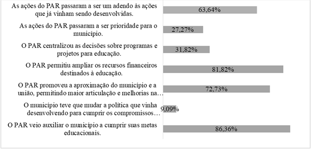 Neste contexto, foi solicitada a opinião dos pesquisados a respeito do PAR. A grande maioria relatou que o plano: auxiliou o município a cumprir suas metas educacionais (86,4%); permitiu ampliar os recursos financeiros destinados à educação (81,8%); promoveu a aproximação do município à União, permitindo maior articulação e melhorias na gestão educacional (72,7%) e passando a ser um adendo às ações que já vinham sendo desenvolvidas (63,6%), conforme ilustra a figura 4.