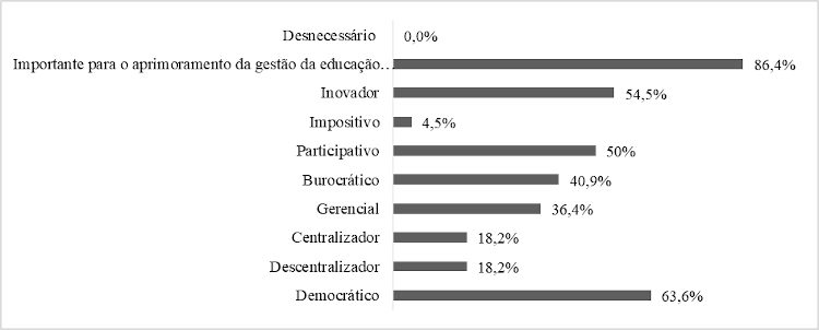 Desta forma, o PAR foi considerado por 86% dos pesquisados, importante para o aprimoramento da gestão da educação municipal, 63,6% o avaliaram como democrático, 54,5% inovador e 50% participativo. Um número menor de pesquisados o apontou como burocrático (40,9%) e gerencial (36,4%), sendo que 18,2% o classificaram como descentralizador e o mesmo número como centralizador. Todavia, não foi apontado como desnecessário por nenhum dos pesquisados (Figura 5), ou seja, uma avaliação positiva do plano.