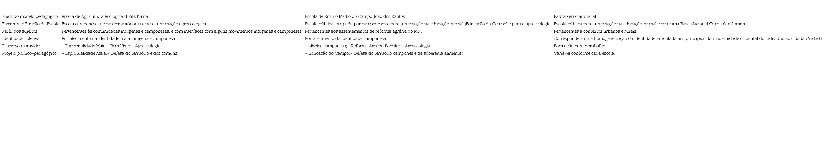 Ao analisarmos processos educativos erigidos em microcontextos do campo, em particular no México e no Brasil, identificamos que ainda é um desafio para a Política Nacional de Educação de cada país atrelar a concepção de um processo educativo-pedagógico que atenda, plenamente, toda a demanda educativa, sobretudo em contextos rurais (BARBOSA, 2017; GÓMEZ-SOLLANO, 2017). Além disso, um dos principais desafios postos à gestão das políticas públicas em matéria educativa consiste em compreender que a concepção de educação advinda de organizações camponesas e indígenas não se limita à reivindicação do acesso à escola, ou mesmo da existência da escola e da educação formal em seus territórios. Essas organizações concebem a educação em um sentido omnilateral, de recuperação da humanização das relações sociais, em sentido freiriano, e de um processo formativo que reestabeleça o vínculo com a natureza. Com base nos dados coletados, elaboramos uma tabela dos eixos que articulam o modelo pedagógico das escolas em análise e suas diferenças frente ao padrão escolar da política nacional de educação dos países em questão.9