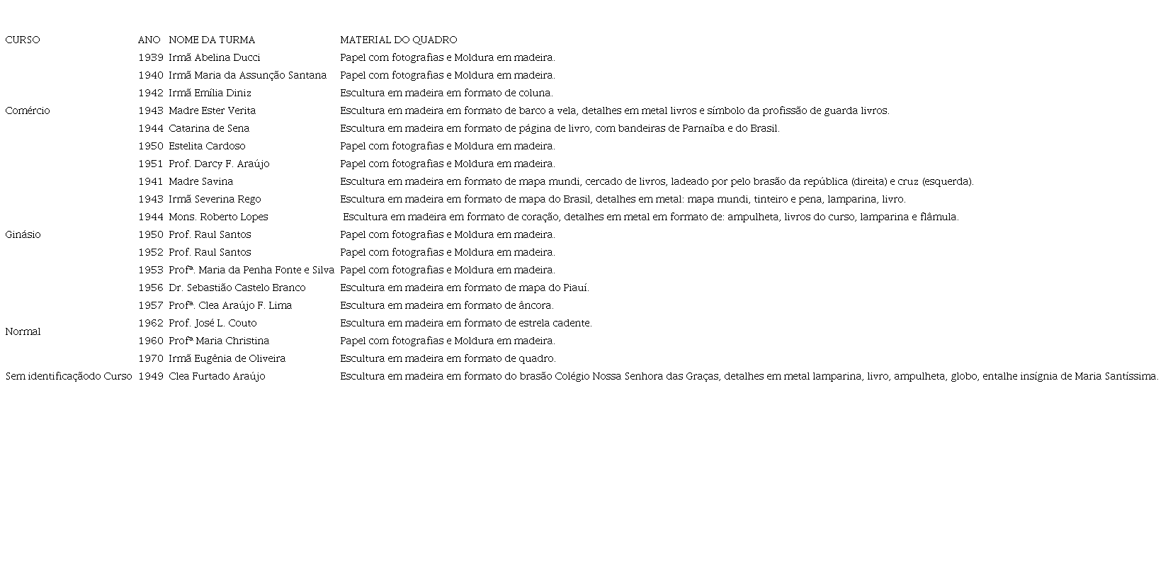 No entanto, quando observamos o conjunto dos quadros de formatura do Colégio do Colégio Sagrado Coração de Jesus, encontramos somente uma escultura de madeira produzida pela Turma de 1942 do Curso Normal; contraditoriamente, a prática estabelecida pelas turmas anteriores e posteriores utilizaram a composição do conjunto: desenho/ilustração e fotografia, moldura de madeira e vidro para os quadros de formatura.